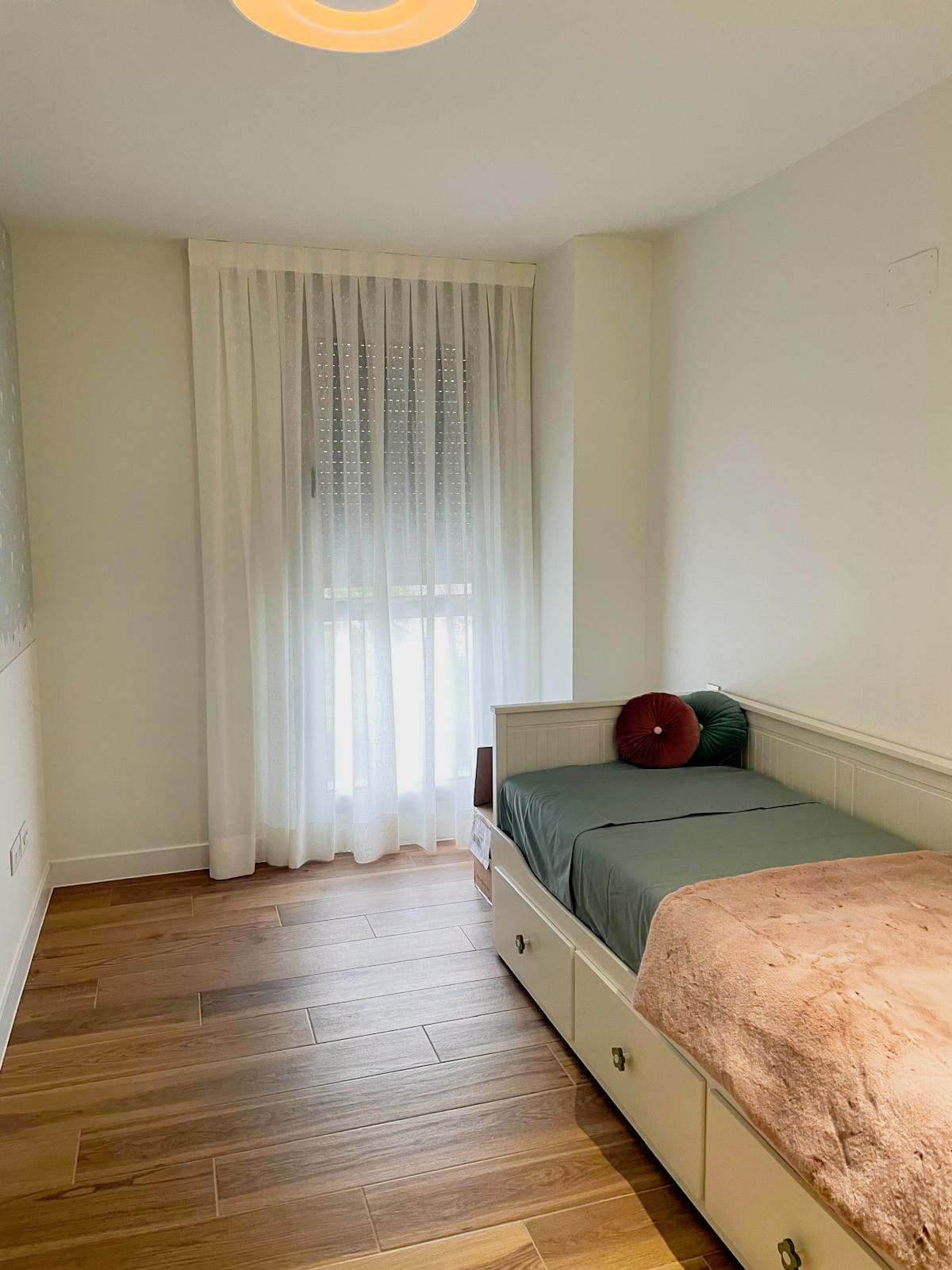 Apartamento Valladolid: el proyecto de diseño mejor valorado de 2024 por nuestros clientes y seguidores. Os presentamos un claro ejemplo de cómo, con una planificación eficiente y una distribución inteligente, se pueden cubrir todas las necesidades de una vivienda para tres integrantes: una pareja y su pequeño en crecimiento. No falta detalle: dormitorio principal, habitación infantil con espacio suficiente para incorporar en el futuro una mesa de estudio y más mobiliario de almacenamiento, cuarto de baño y un salón-comedor integrado con la cocina; que respiran armoniosamente gracias al amplio ventanal original de la construcción y la cuidadosa zonificación que planificamos. Nada se solapa; todo fluye y se complementa.