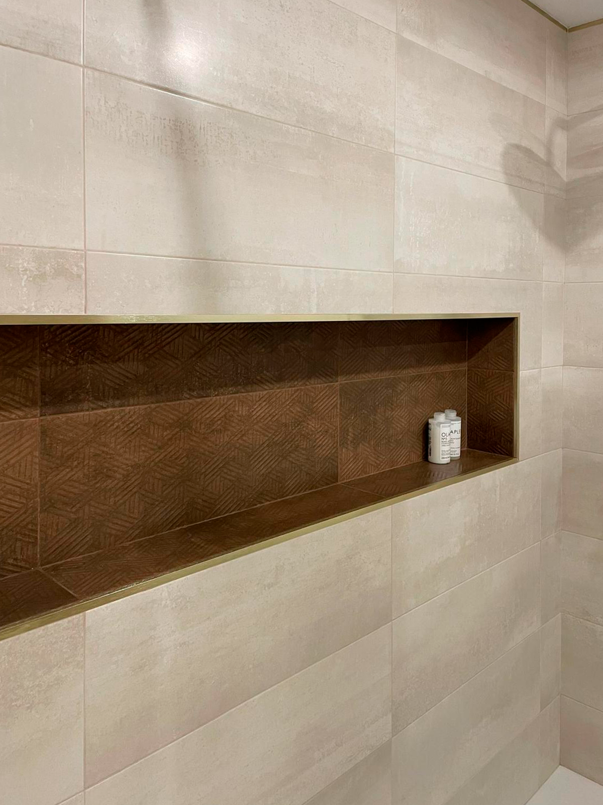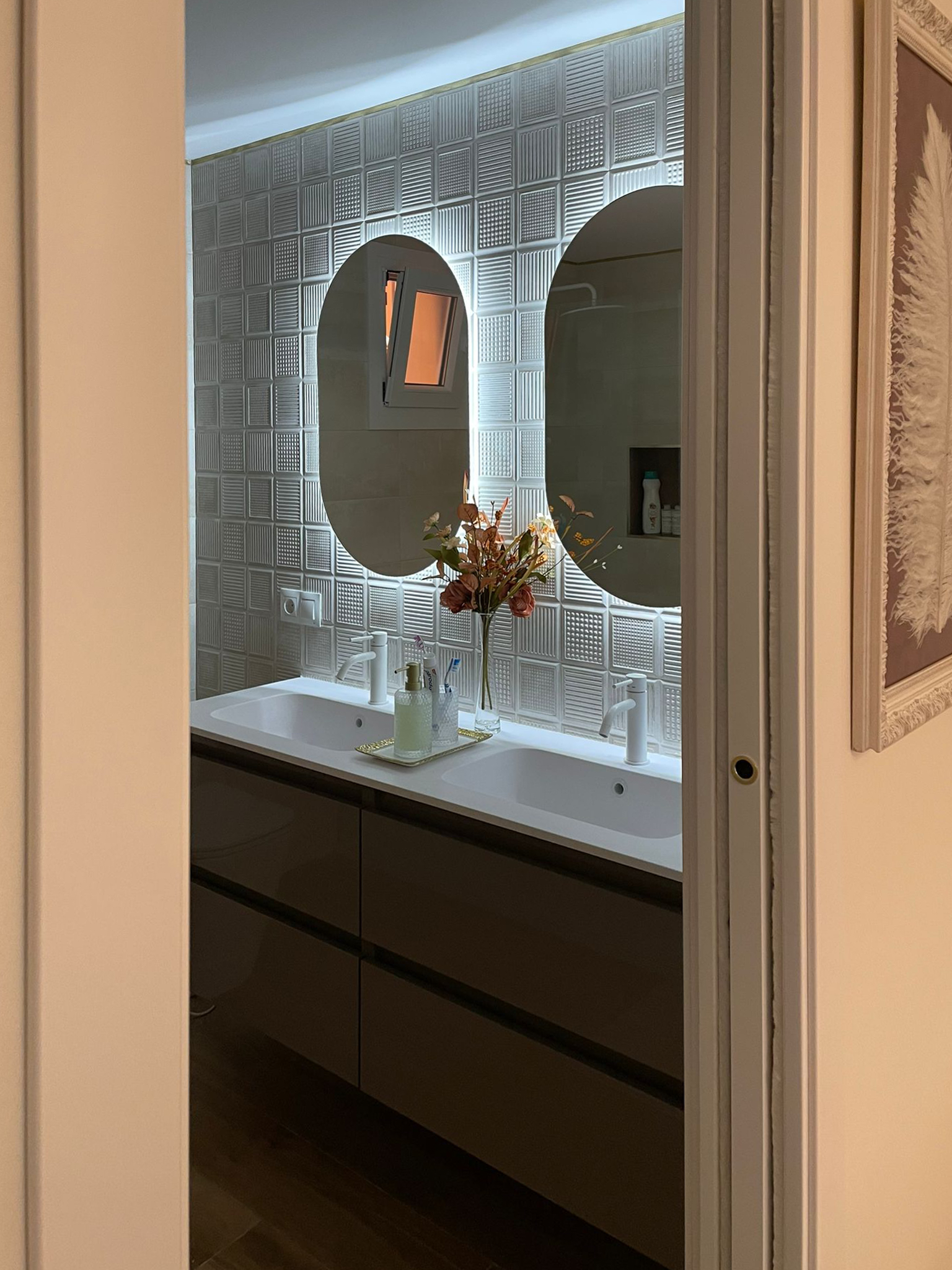 Nosotros no hemos querido quedarnos atrás y hemos apostado por estos espléndidos espejos ovalados que integran luz LED y un sistema antivaho de última generación. Además de ser altamente funcionales, enfatizan el revestimiento sinuoso de la pared gracias a su iluminación constante y precisa, que realza el contraste entre las formas curvas y angulosas.