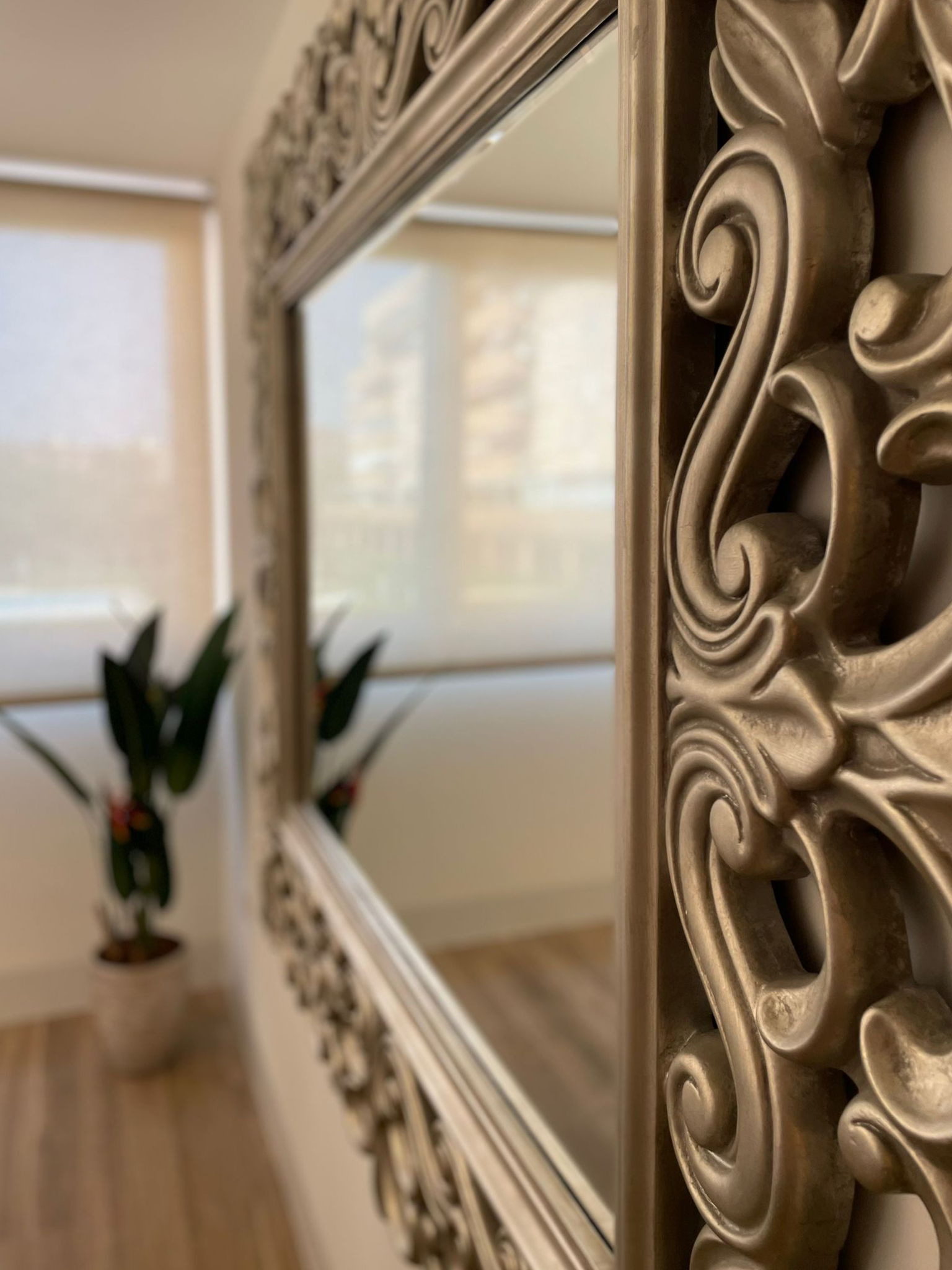 Por otro lado, mantenemos la conexión entre ambas zonas eligiendo diferentes grados de grises, beiges y marrones que en mayor o menor presencia, pero siempre en ambos lados, se abrazan y fomenta una habitación armoniosamente conjuntada. Cabe destacar como elementos de interés los relieves romboidales bordados en las sillas y el inmenso espejo colonial pintado en plata que recorre casi todo el largo de la mesa comunal.