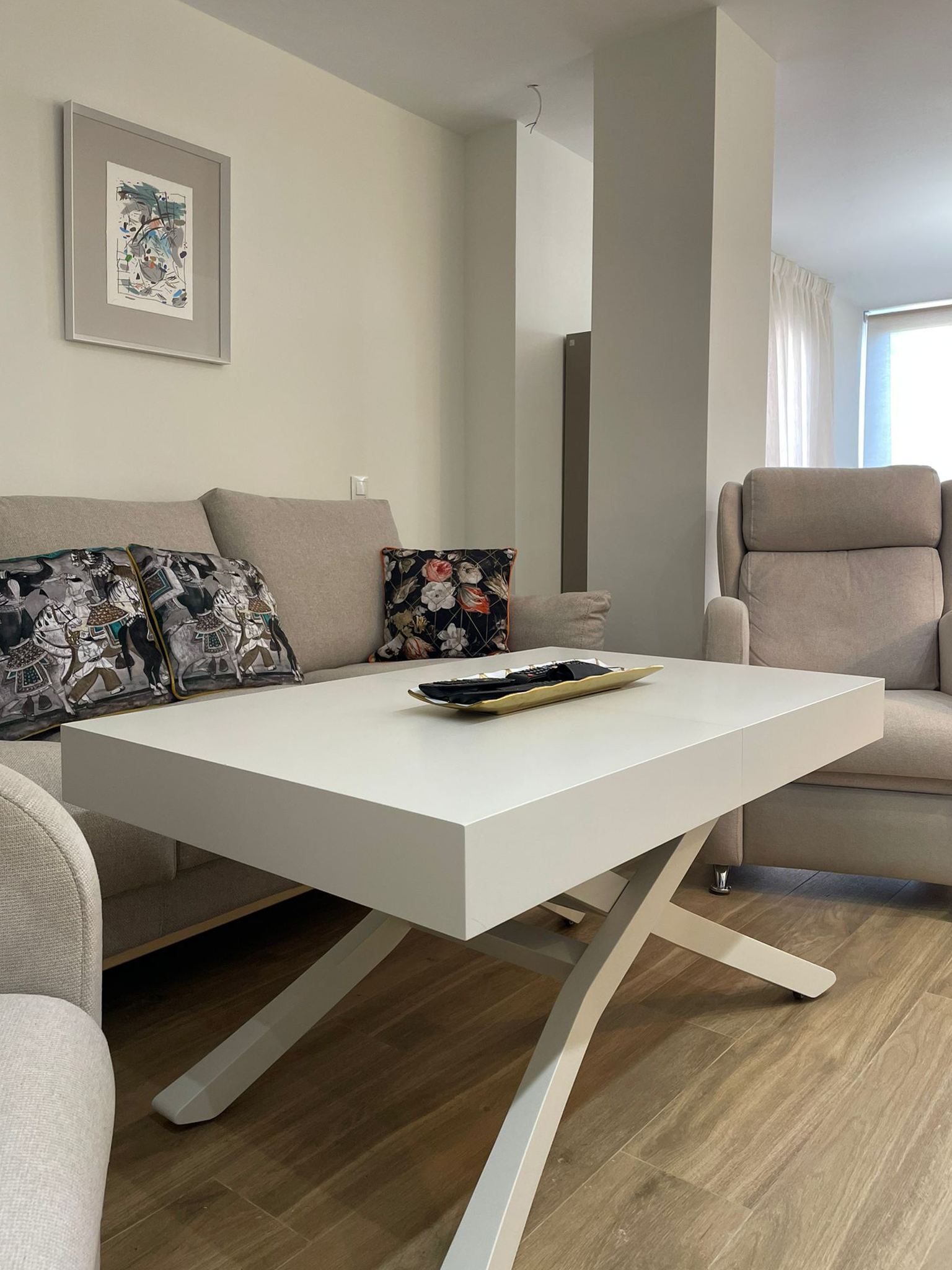 Intrincadamente delicioso el juego entre los dos niveles de alturas para diferenciar la zona de comedor y la de relajación-confort. Sin apenas unos centímetros de diferencia y con un revestimiento continuo de parquet que simula el roble, obtenemos la calidez propia de la madera, siempre tan reconfortante y acogedora.